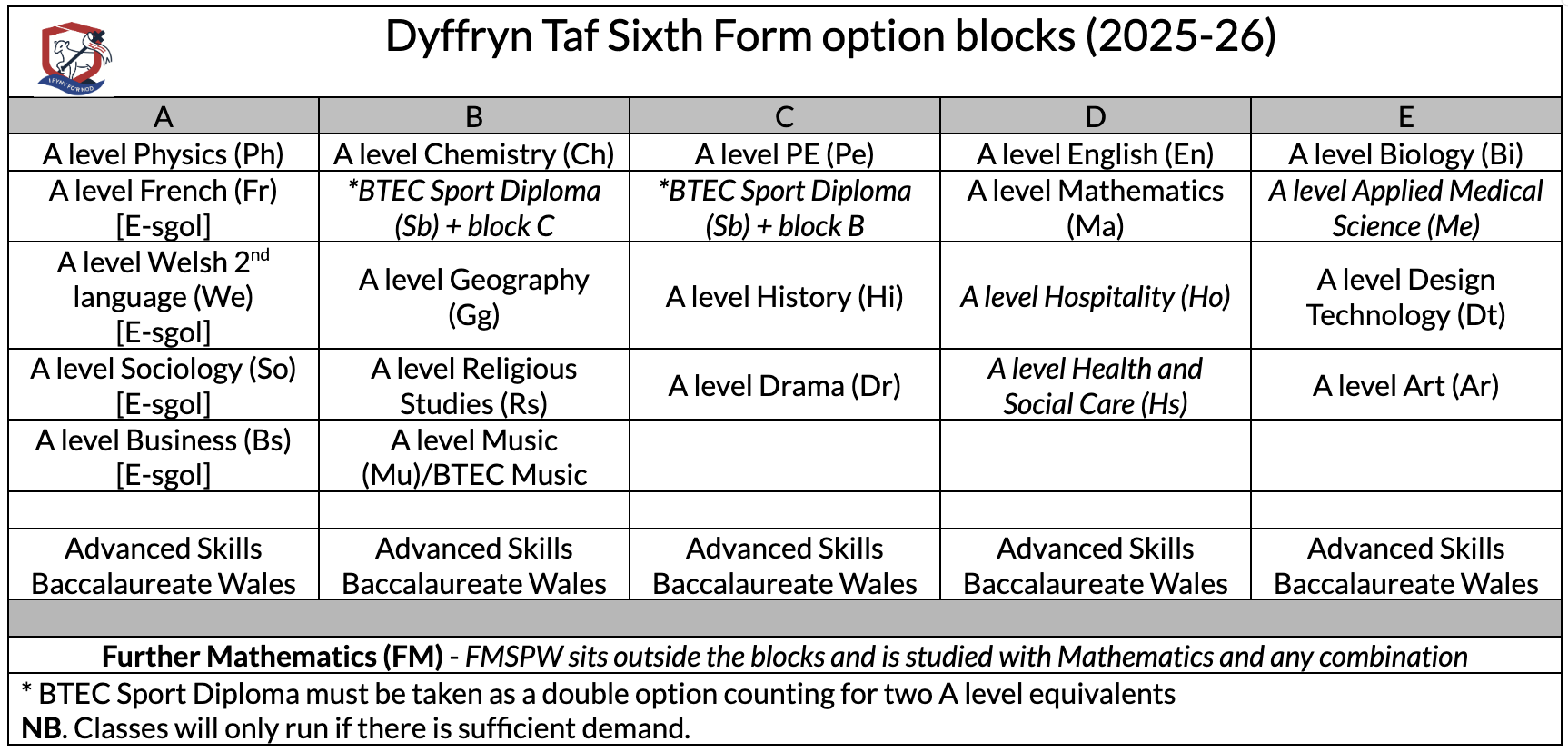 | Business A level (E-sgol) | 5 GCSEs A*-C including Maths and English |